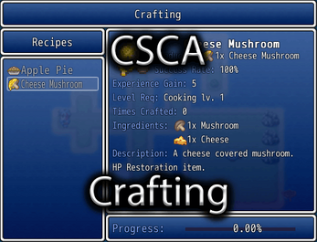 This script works well in combination with CSCA Professions, though it is not required. This can allow you to make professions like cooking, blacksmithing, etc. The crafting plugin can use this integration for level requirements to craft certain recipes, as well as automatically awarding experience for that profession when something is crafted.
